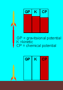 Energy can not be created or destroyed it can only change forms. The sum of kinetic and gravitational potential energies is greater than the loss of chemical potential energy. In actual fact the sum of both kinetic and gravitational potential should equal the loss in chemical potential.