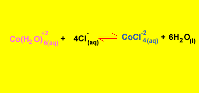 Now add 3ml of saturated NaCl solution and heat the mixture over a bunsen flame. Most of the ions are now CoCl4-2 . Note the colour change. Click to see 120kb movie. of the colour change. Now cool the mixture under running water and once again notice the colour change.
