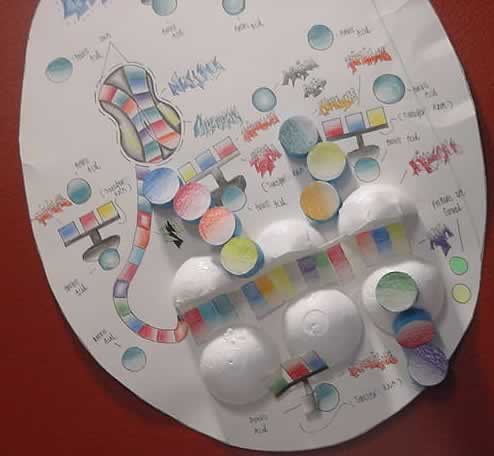 This is an example of a near perfect assignment. Notice how the amino acid sequence on the growing protein chain matches the codon sequence on the mRNA. Also note how the triplicate code on the surface of the tRNA complements the codons on the mRNA. |