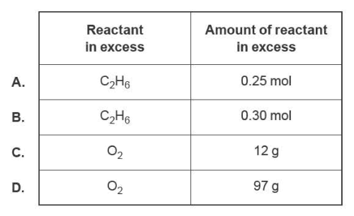 3) 0.50 mol of ethane, C2H6 , and 100.0 g of air that is 22.0% m/m oxygen, 02, are injected into a combustion chamber. The equation of the combustion of ethane is