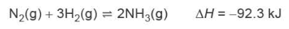 8) Ammonia gas, NH3(g), can be made by reacting a mixture of nitrogen gas, N2(g), and hydrogen gas, H2(g), using an iron catalyst. The equilibrium constant, Kp, at 400 °C is 1.60 x 10-8 kPa-2. Solution b. Determine the partial pressure of NH3 , in kPa, in the equilibrium mixture at 400 °C. Solution c. At a constant temperature of 400 °C, a change was made to the equilibrium system. Just after the change was made, the reaction quotient, Q, was 1.20 x 10-9 kPa-2. Solution d. Explain how the iron catalyst addresses the conflict between optimal rate and temperature considerations in the production of NH3 Support your answer with reference to one green chemistry principle. Refer to item 26.ii of the Data Book. Solution