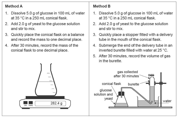 3. Lucia, a VCE student, investigated the production of bioethanol from the fermentation of glucose solution in the presence of yeast. Enzymes in yeast assist with the fermentation reaction. Lucia trialled two methods for the investigation, Method A and Method B. Both methods were trialled once. Write a balanced chemical equation for the production of bioethanol from glucose. 1 mark Solution Solution b. Lucia recorded the followi i. Calculate the amount, in mol, of gas produced using Method A. The molar mass of the gas produced is 44.0 g moI - 1. 1 mark Solution Solution Solution Solution
