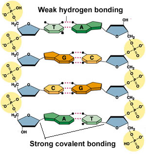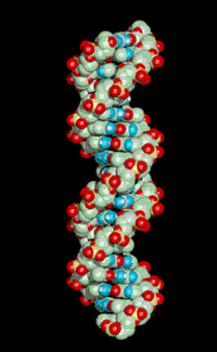 The DNA molecule is composed of two strands, as shown on the right, linked together by hydrogen bonding. The two strands twist around each other forming a helical structure, as shown by the animation above. Notice how cytosine and guanine bond together and thymine and adenine bond together. This type of pairing means that the base sequence on one strand is complementary to the sequence on the other strand. For example if adenine is bonded on one strand there should be a thymine bonded opposite on the other strand. Three major differences become apparent when looking at the DNA and RNA polymers. One is that the backbone of RNA has ribose rather than deoxyribose as the sugar. The second difference is that the base thymine is replaced by uracil. The third is that RNA is a single stranded polymer where as DNA is a double stranded helical polymer. |