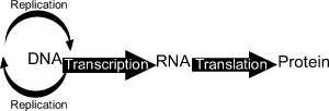 A summary of the role of nucleic molecules and protein is shown on the right. DNA undergoes self replication to produce more DNA and transcription to produce RNA. RNA is then translated to protein. |