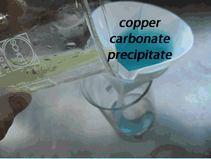 | It is important to wash the precipitate trapped in the filter paper thoroughly. Many unwanted ions may adhere to the crystals of the precipitate and if not washed off will give an inflated value of the mass of the precipitate. In this case since we are using copper nitrate to precipitate the carbonate ions the nitrate ions (NO3-) will be present on the precipitate and need to be washed off, as shown on the right |  |