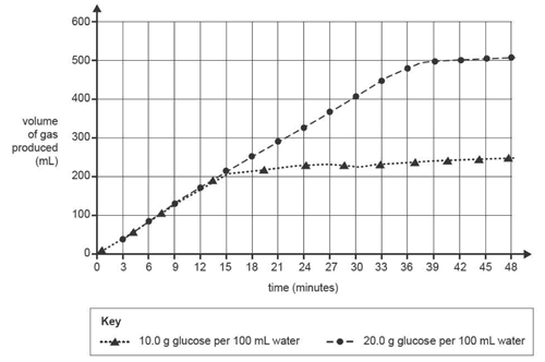 c. Lucia decided to use Method B with different amounts of glucose to test how changing the concentration of the glucose solution affects the rate of bioethanol production. Lucia recorded the volume of gas produced at three-minute intervals instead of only after 30 minutes. The graph below shows the data produced. i. What is the independent variable in this investigation? 1 mark Solution ii. Does the graph support Lucia's hypothesis? Explain your answer. 2 marks Solution d. i. Identify one limitation of Method 8. Your answer must be different to your answer for part b.iii. 1 mark Solution