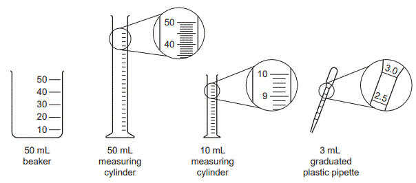 1) Irfan is conducting an experiment in which two aqueous solutions, hydrogen peroxide, H2O2, and a vitamin C solution are reacted together in a beaker. This reaction is known to have a delayed but obvious colour change. The vitamin C solution is prepared by crushing a vitamin C tablet and dissolving it in deionised water, then adding iodine, I2. Irfan is investigating how changing the concentration of vitamin C in the solution affects the time taken for the colour change to occur. The concentration is changed by adding different volumes of deionised water to 5.0 mL of the vitamin C solution before reacting it with H2O2. Irfan repeats the experiment twice for each concentration. a. Some of the equipment used during the experiment is shown below.