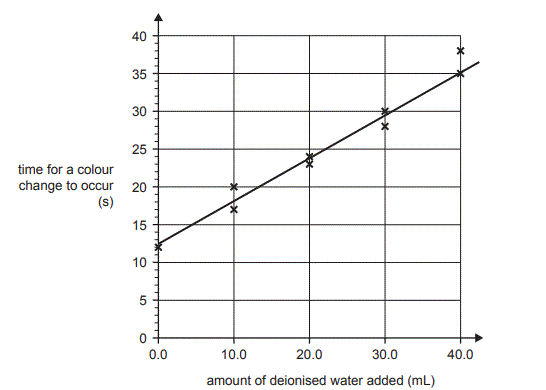 The resolution of the equipment shown, from lowest to highest, is Solution b. A graph showing the time for a colour change to occur versus the amount of deionised water added is shown below.