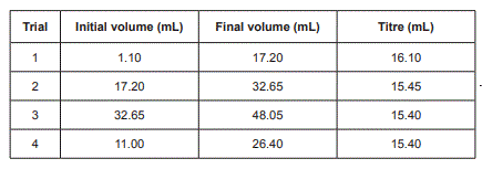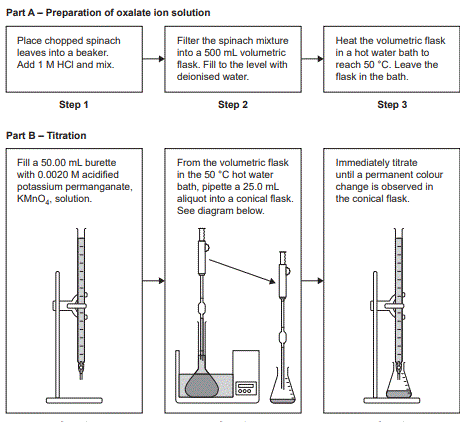 a. Circle the scientific investigation methodology that Karolina most likely used to develop her hypothesis. (1 mark) case study fieldwork literature review modelling C2O42- reacts with permanganate ions, MnO4-, according to the equation below 2MnO4- (aq) + 5C2O42-(aq) + 16H+(aq) → 2Mn2+(aq) + 10CO2(g) + 8H2O(l) b. Refer to item 7 of the Data Book. What specific observation did Karolina use to determine the end point of the titration? (1 mark) Solution c. The reaction was conducted at 50 °C rather than at room temperature. i. Use collision theory to state why this is a preferred temperature at which to conduct the reaction. (1 mark) ii. State why the experiment might no longer be valid if the reaction is conducted at room temperature. (1 mark) Solution Results Karolina recorded the titration results for the uncooked spinach in the table below.