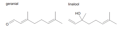 Solution 4. During fermentation, yeast will produce other volatile polar compounds that have similar boiling points to ethanol, C2H6O. Which one of the following methods would be most suitable to separate these compounds from C2H6O? Solution 5. Geranial and linalool are two natural organic compounds found in essential oils extracted from some citrus fruits. The skeletal structures for geranial and linalool are given below.