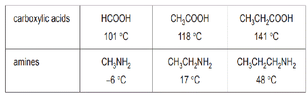 9. Many industries, such as the pharmaceutical industry, need to produce a range of organic compounds. a. Simple hydrocarbons are the usual raw material used to produce haloalkanes, amines, alcohols, carboxylic acids and esters. i. Write a balanced equation to show the production of C3H7Cl from C3H8. Include the reaction conditions.(2 marks) Solution ii. Name two reactants required to form propan-1-amine, C3H9N, in a single substitution reaction. (2 marks) Solution During the production process, routine quality testing occurs. After testing, the samples are collected as organic waste. In order to dispose of the waste safely, the components must be separated. b. The waste from one laboratory was a mixture of amines and carboxylic acids. The amines were separated from the carboxylic acids on the basis of their different boiling points. Boiling points of the first three compounds in the carboxylic acid and amine series are listed in the table below.