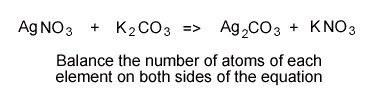 equation with the reactants on the left and the products on the right. silver nitrate + potassium carbonate => silver carbonate + potassium nitrate. | |