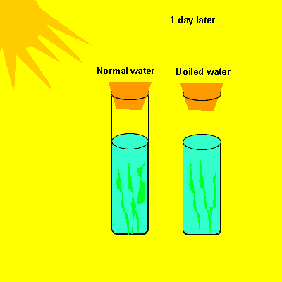 | She placed identical plants in sealed test tubes as shown on the right. One test tube had boiled water obtained from the tap while the other had normal water from the same tap. After observing the outcome