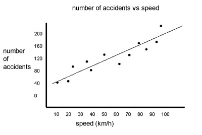 | 9) A researcher graphs the number of accidents in a particular year versus the speed of the car involved. The graph is shown on the right. a) The dependent variable is ____________________ b) The independent variable is ____________________ c) Is there a clear relationship between speed and the chance of having an accident? Explain. |  |